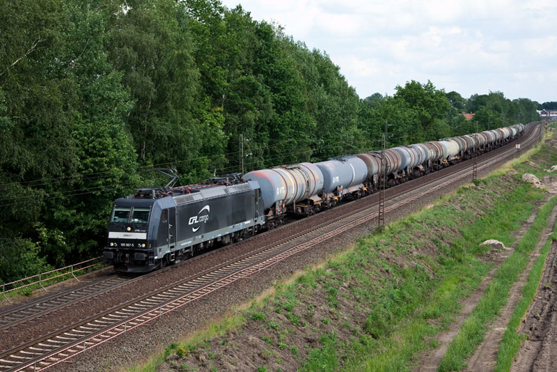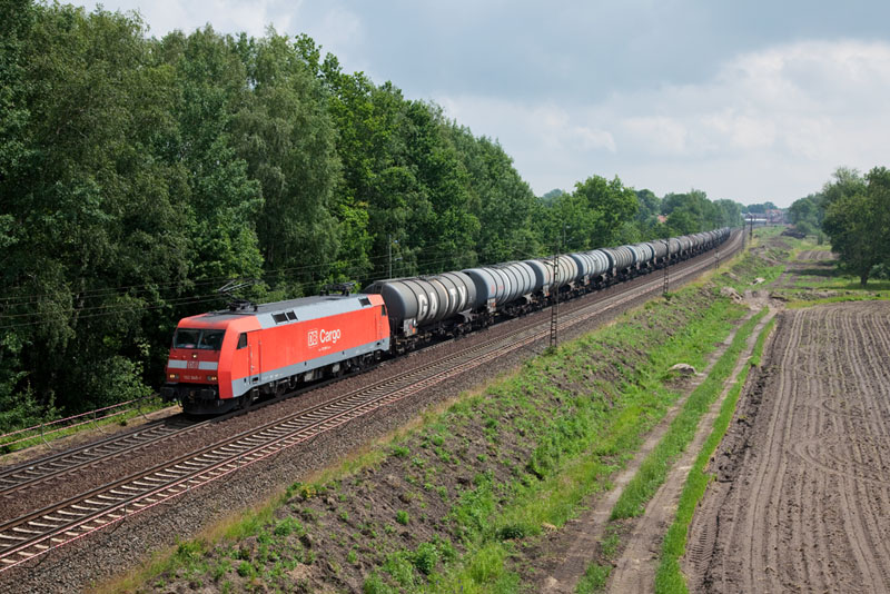 | Diesen Kesselwagenzug brachte die 185 567-5 in den Norden. Grevelau, 7. Juni 2012 |