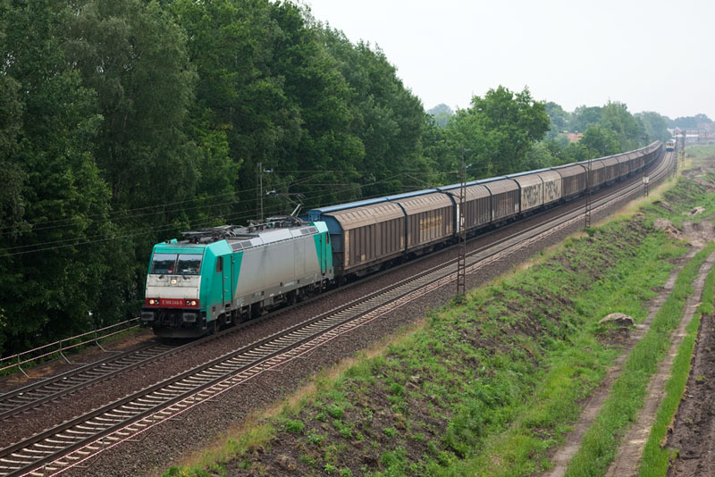| Die für die CFL Cargo fahrende E 186 246-5 mit einem Schiebewandwaggonzug. Grevelau, 7. Juni 2012 |