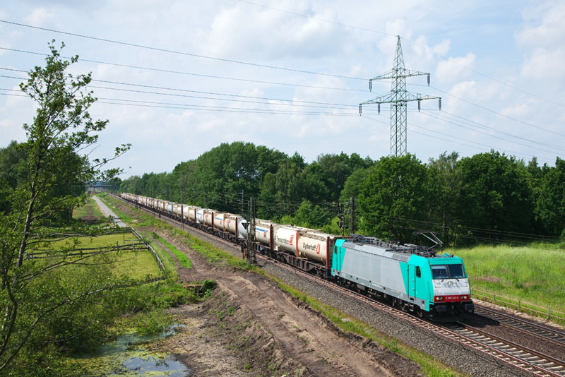 | Der Kalkmehlstaubzug von Padborg nach Rohdenhaus mit der E 186 247-3 der CFL Cargo. Grevelau, 7. Juni 2012 |