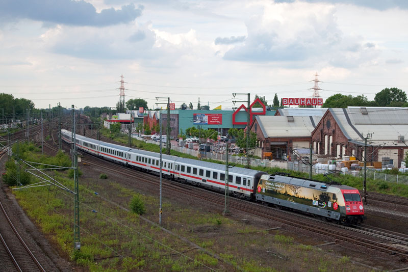 | Auch die 101 025-5 macht Werbung für "Packendes Südafrika", hier mit dem IC 2379. Hamburg-Harburg, 7. Juni 2012 |