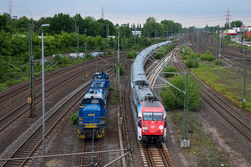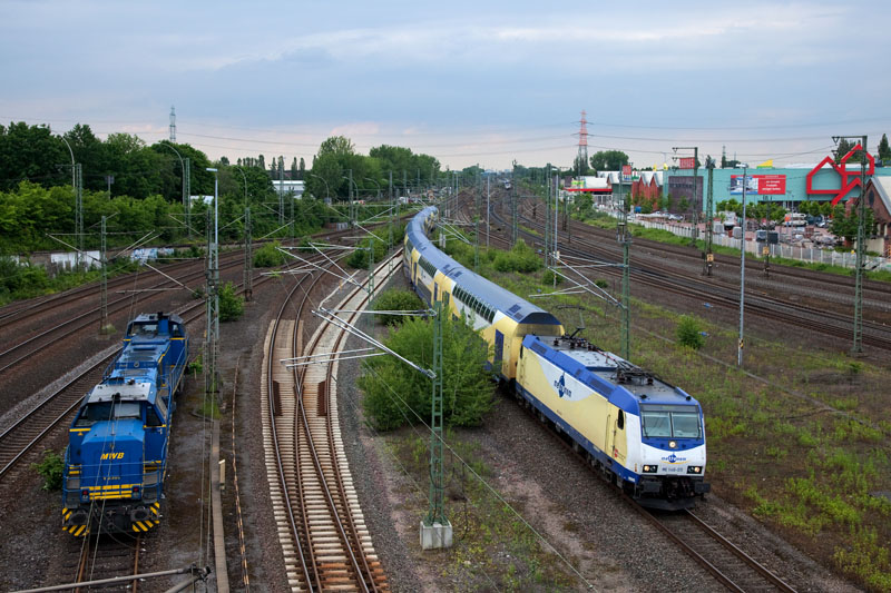 | Einfahrender metronom mit der ME 146-05 neben den Dieselloks der MWB. Hamburg-Harburg, 7. Juni 2012 |