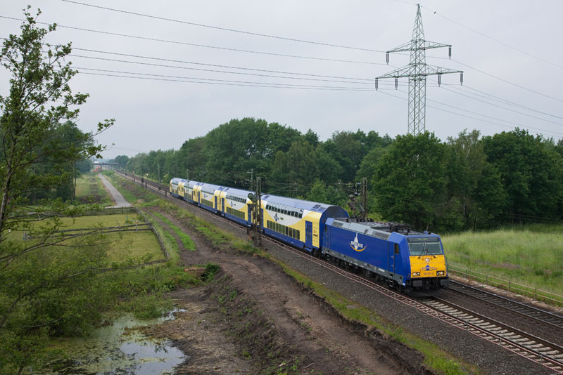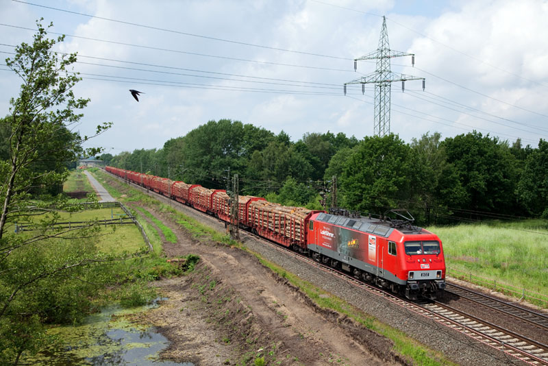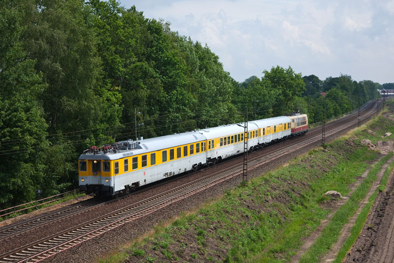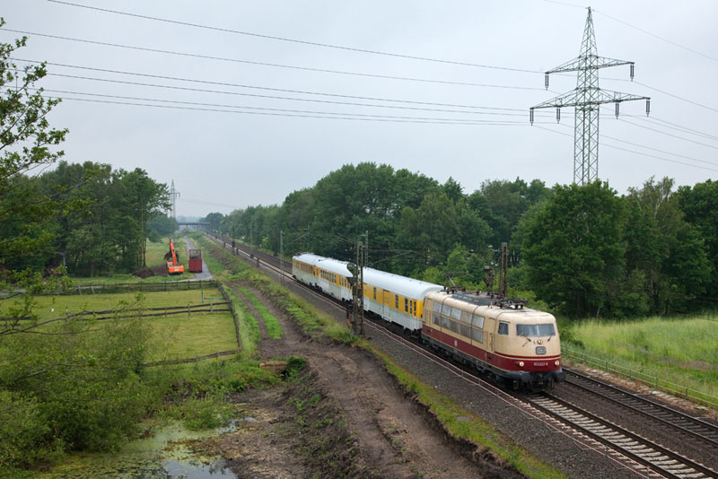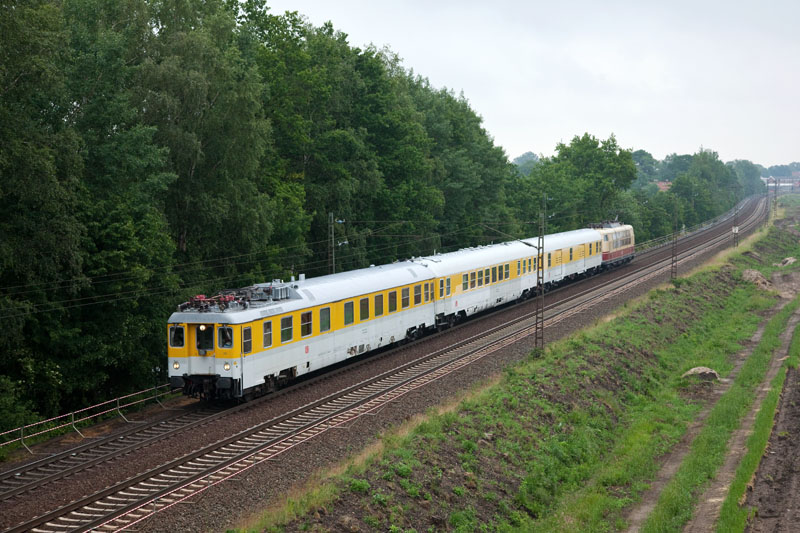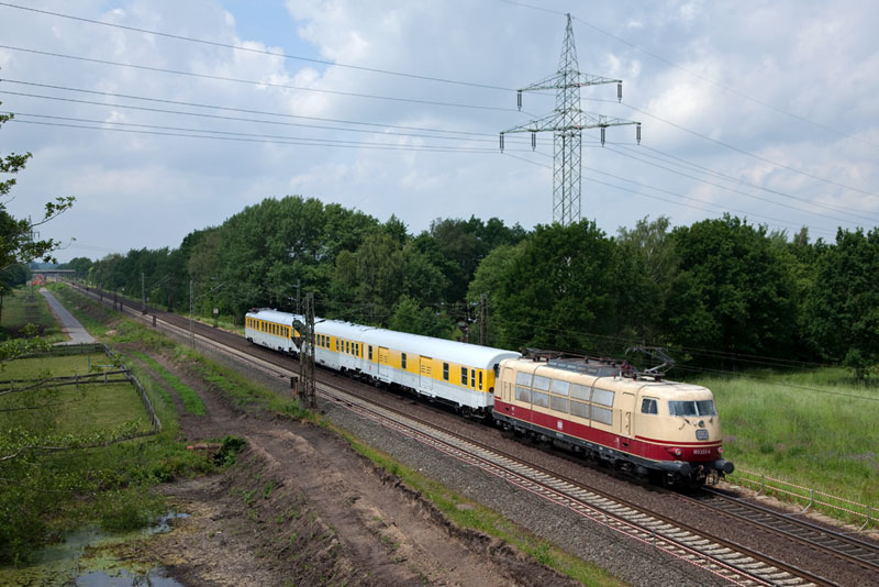| An diesem Tag pendelte die 103 222-6 von DB Systemtechnik mit ihrem Messzug zwischen Hamburg und Winsen. Grevelau, 7. Juni 2012 |