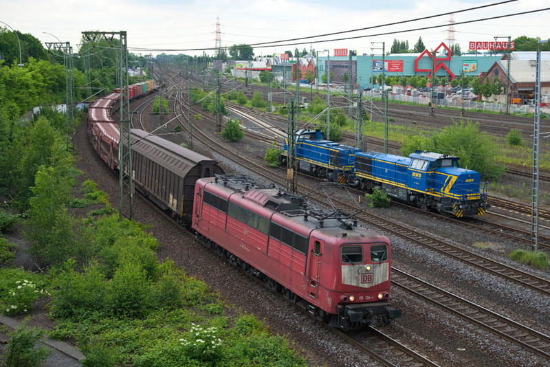 | Eine der letzten orientroten Loks mit "Latz", die 151 134-4, und das noch mit Scherenstromabnehmern! Hamburg-Harburg, 7. Juni 2012 |