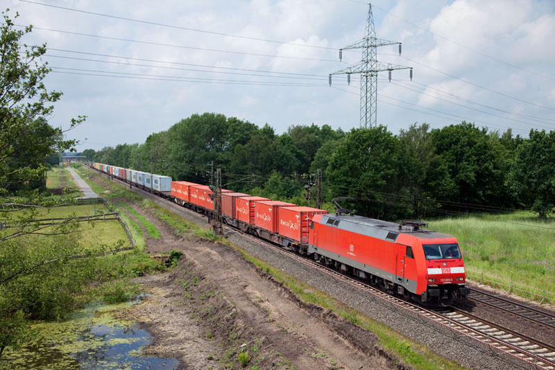 | Aus der Gegenrichtung kam die 152 003-0 mit einem Containerzug. Grevelau, 7. Juni 2012 |