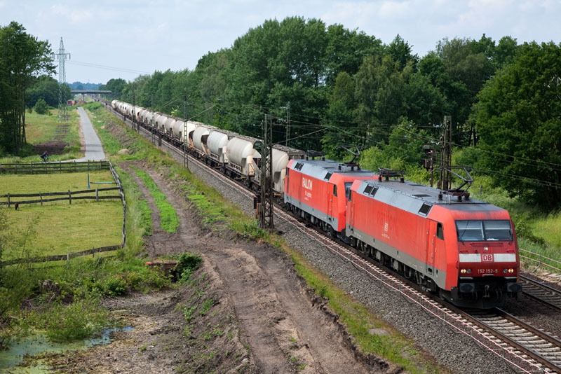 | Ein starkes Tandem, die 152 152-5 und 152 118-6 mit einem Cerealienzug von Hamburg-Hohe Schaar. Grevelau, 7. Juni 2012 |