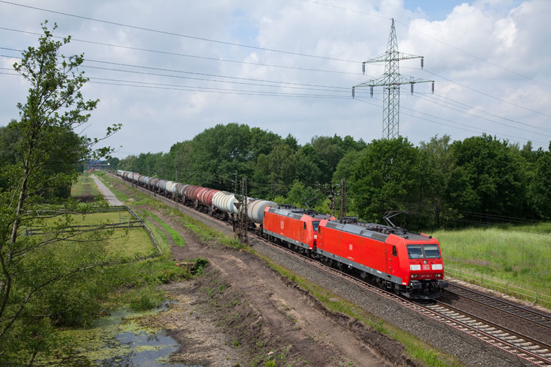 | Einen Kesselwagenzug hatten die 185 159-1 und 185 006-4 in den Süden zu bringen. Grevelau, 7. Juni 2012 |