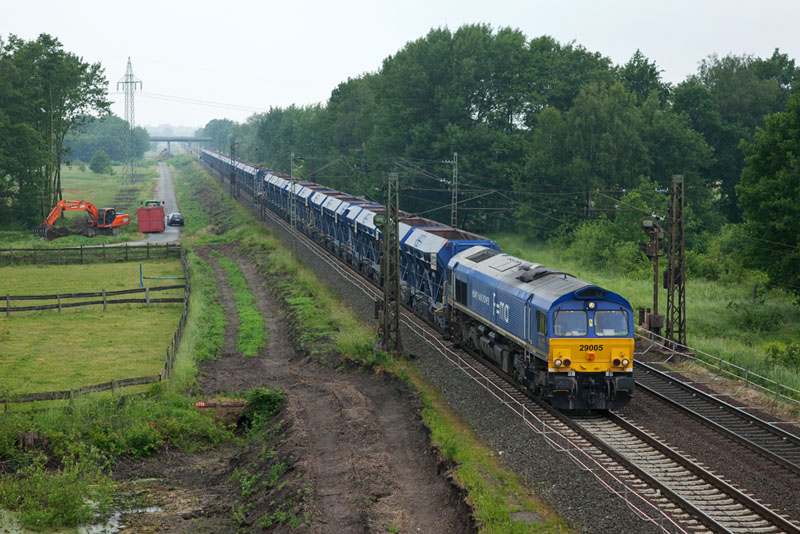 | HEAVY HAUL POWER! Die 29005 der HHPi mit einem leeren Baustoffbomber von Hamburg. Grevelau, 7. Juni 2012 |