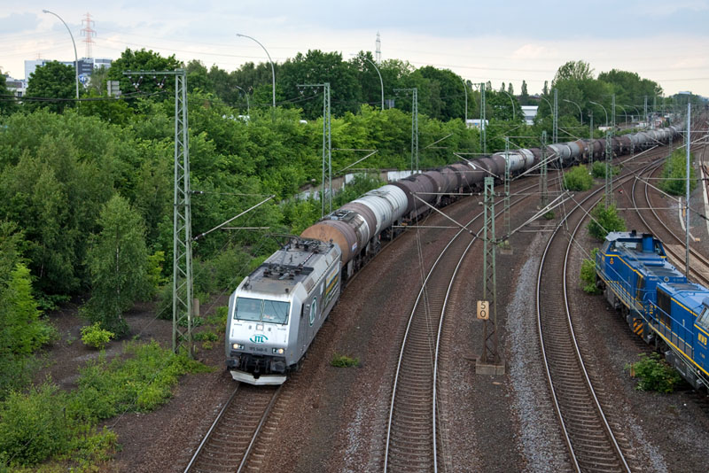 | Die silberne 185 548-5 der ITL mit einem Kesselwagenzug von Hohe Schaar. Hamburg-Harburg, 7. Juni 2012 |