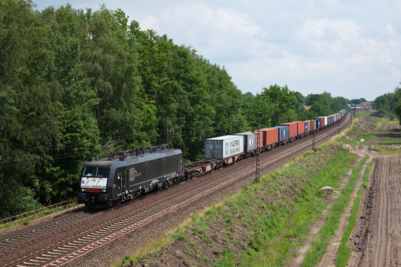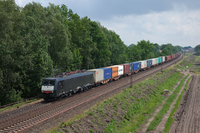 | Die ES 64 F4-841 der MRCEdispolok mit einem Containerzug nach Hamburg. Grevelau, 7. Juni 2012 |