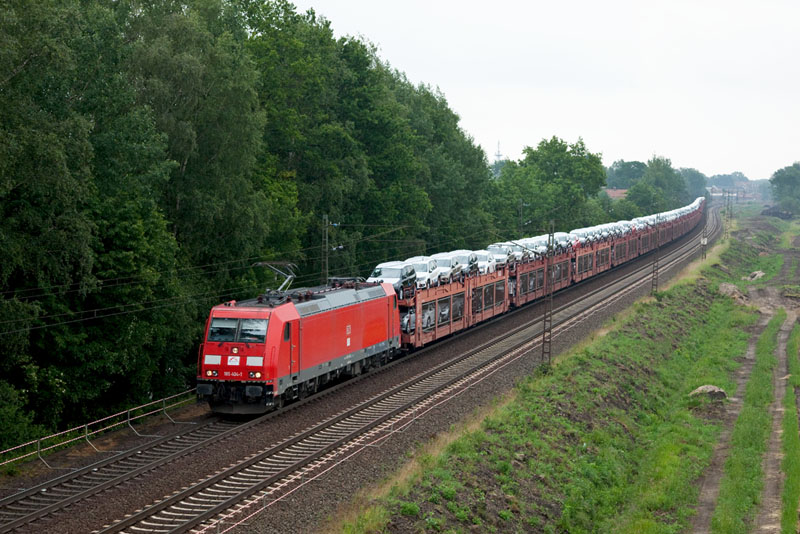 | Die von DB Schenker an die TX Logistik vermietete 185 404-1 mit einem Autologistikzug in den Norden. Grevelau, 7. Juni 2012 |