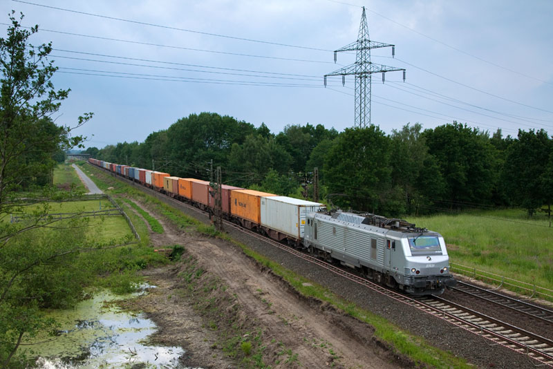 | Ein Containerzug mit der "Französin" E 37 031 der akiem. Grevelau, 10. Juni 2012 |