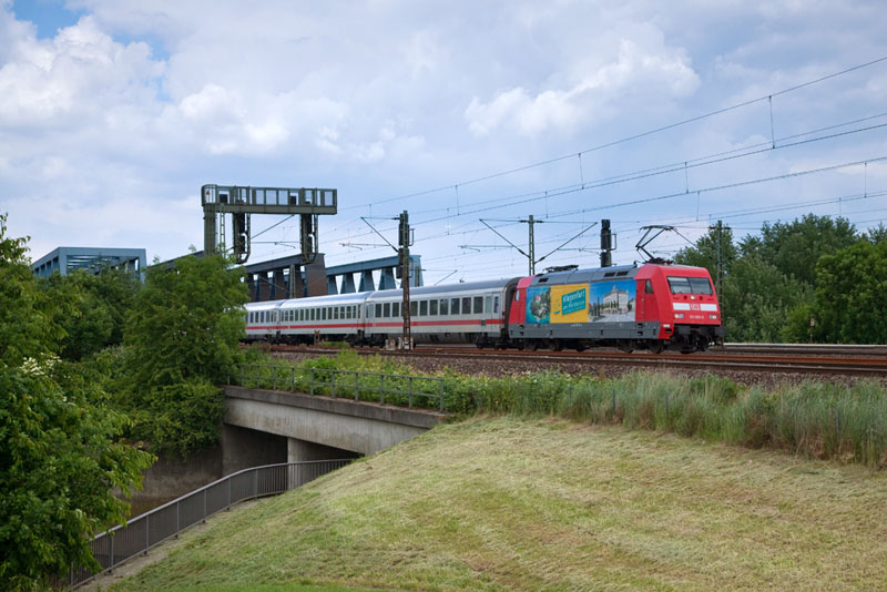 | Der InterCity 2213 mit der 101 001-6, die Werbung für Klagenfurt fährt. Hamburg Süderelbbrücken, 10. Juni 2012 |