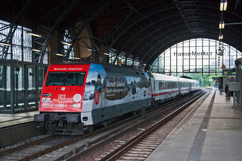 | Die "Packendes Südafrika"-Werbelok 101 025-5 schob ihren IC 2312 nach Altona. Hamburg-Dammtor, 10. Juni 2012 |