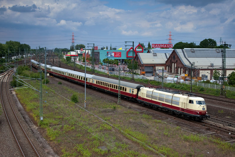 | Der TEE 5461 "Rheingold" Stralsund - Köln mit der 103 235-8 durchfährt den Harburger Bahnhof. Hamburg-Harburg, 10. Juni 2012 |