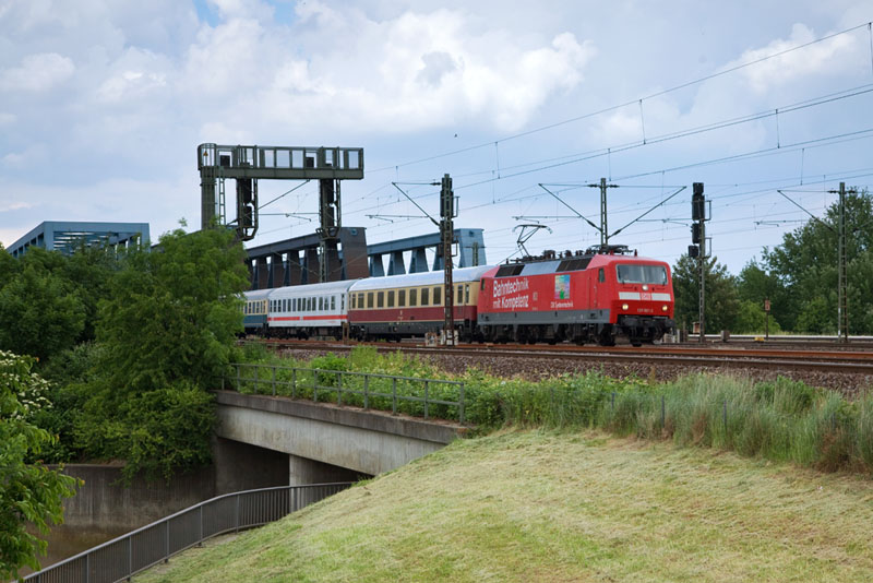 | Die 120 501-2 von DB Systemtechnik mit dem historischen IC 2417 "Hanseat" nach Köln. Hamburg Süderelbbrücken, 10. Juni 2012 |