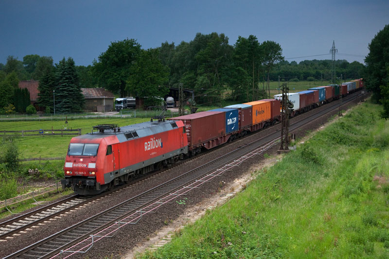 | Die 152 049-3 mit noch mehr Containern aus dem Hamburger Hafen. Grevelau, 10. Juni 2012 |