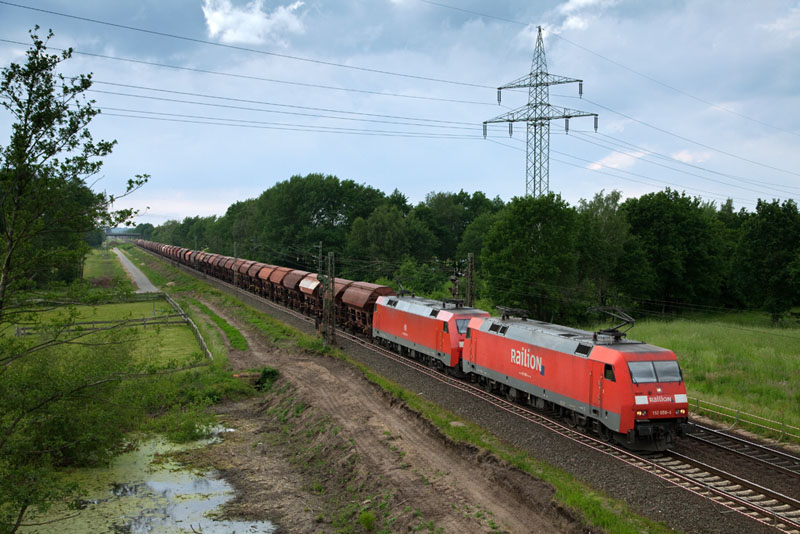 | Ein starkes Doppel bildeten 152 058-4 und 152 164-0 vor einem Kalizug. Grevelau, 10. Juni 2012 |