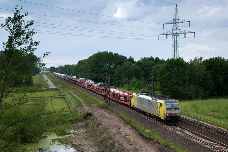 | Einen Autoreisezug nach Alessandria (Piemonte) brachte die ES 64 F4-008 in den Süden. Grevelau, 10. Juni 2012 |