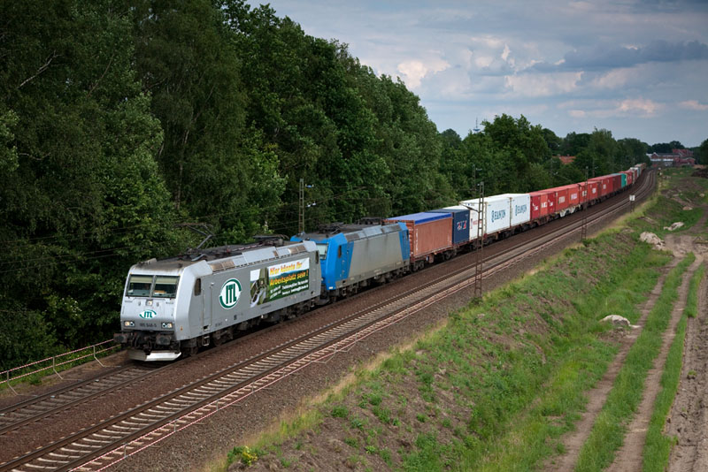 | Die 185 548-5 der ITL schleppte die 185 524-6 und einen Containerzug nach Hamburg. Grevelau, 10. Juni 2012 |
