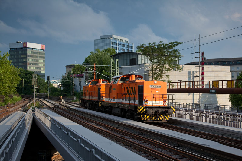 | Auf der Hamburger Verbindungsbahn eilten LOCON 211 und LOCON 215 in Richtung Altona. Hamburg-Dammtor, 10. Juni 2012 |