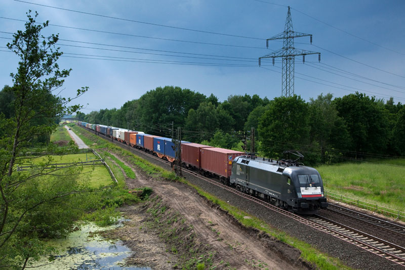 | Noch mehr Seekisten brachte die ES 64 U2-004 der boxXpress.de in den Süden. Grevelau, 10. Juni 2012 |