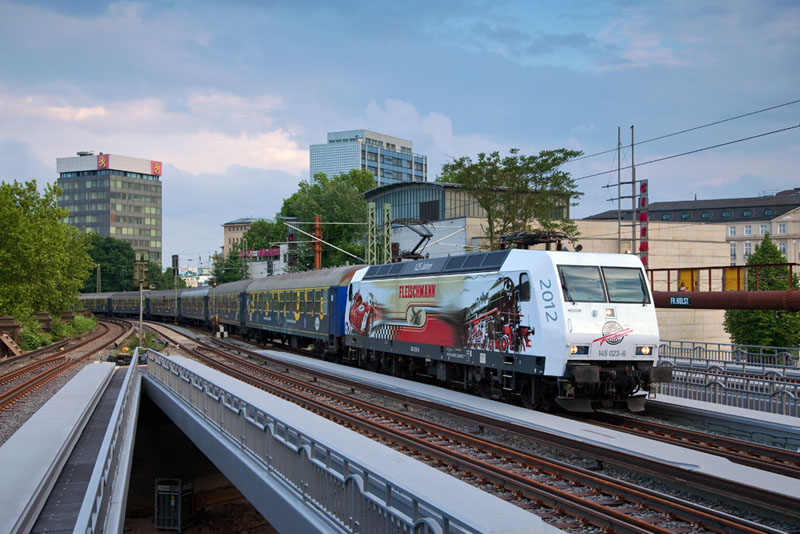 | Der 15 Wagen lange "Bauer Agency Cup" Sonderzug DPF 47515 Amsterdam - Hamburg mit der PRESS 145 023-6. Hamburg-Dammtor, 10. Juni 2012 |