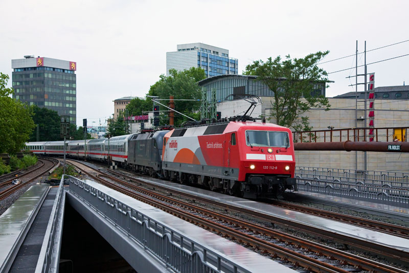 | Die "Märklin"-Werbelok 120 112-8 schleppte die schadhafte ES 64 U2-073 vor dem IC 2082 Königssee nach Altona. Hamburg-Dammtor, 16. Juni 2012 |