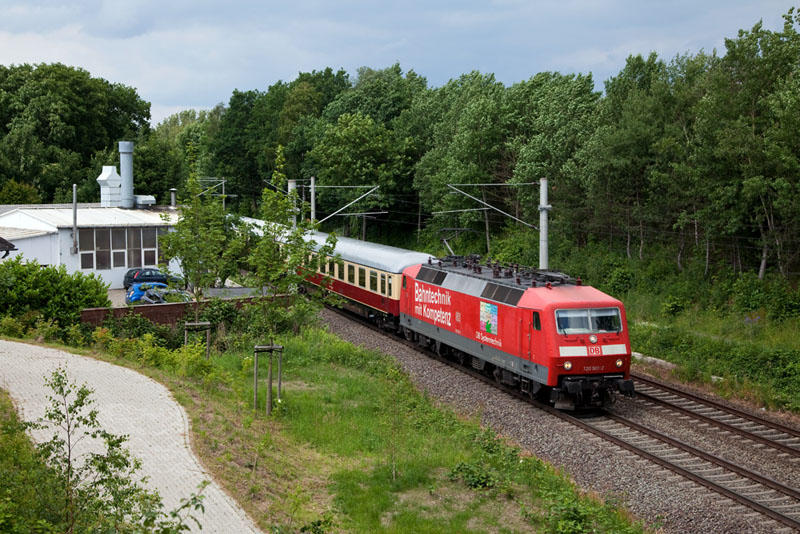 | Mit ordentlich Fahrt hat der IC 2417 "Hanseat" mit der 120 501-2 die Hansestadt Hamburg verlassen. Meckelfeld, 17. Juni 2012 |