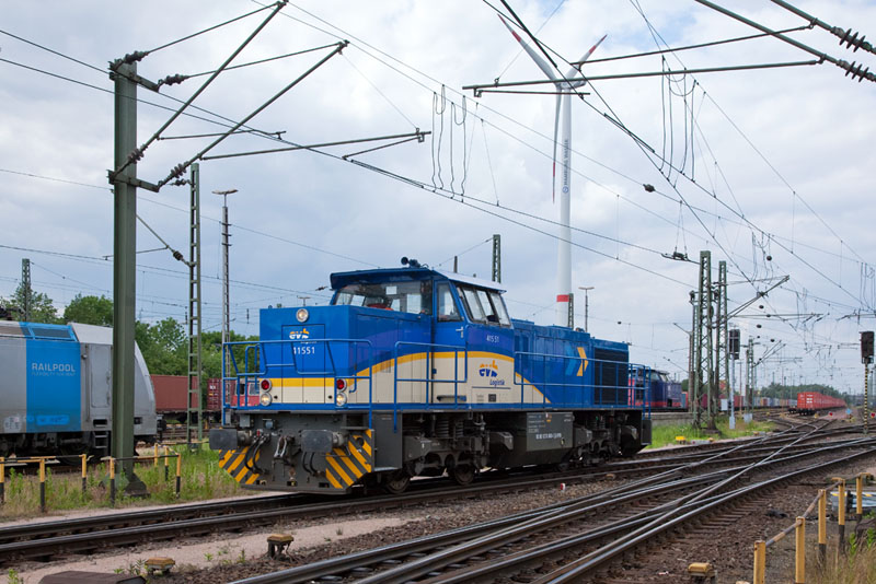 | Die 415 51 der evb Logistik trägt schon das neue Farbkleid der evb Gruppe. Hamburg-Waltershof, 17. Juni 2012 |