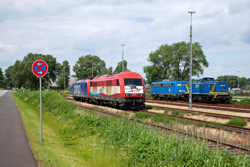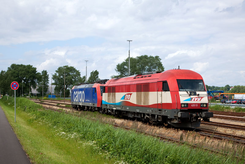 | Die 420 13 der EVB wartete mit laufendem Motor, am Haken hatte die die 482 003-1 der SBB Cargo. Hamburg-Waltershof, 17. Juni 2012 |