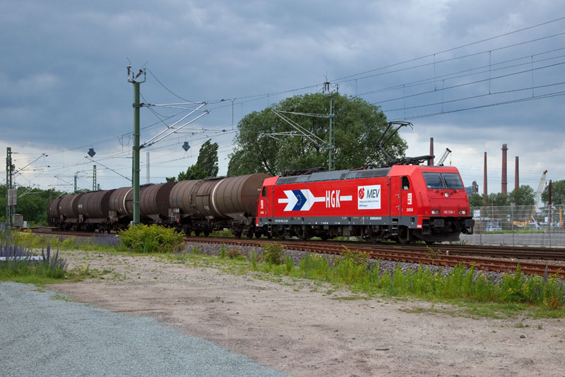| Die 185 588-1 der Häfen und Güterverkehr Köln mit einem Kesselwagenzug ausfahrend. Hamburg-Hohe Schaar, 17. Juni 2012 |