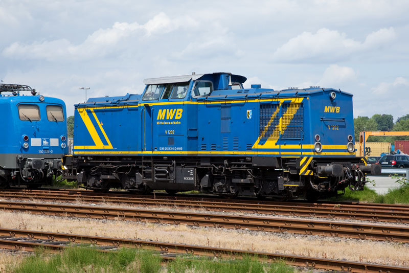 | Die bullige V100 Ost namens V 1202 alias 202 630-0 der Mittelweserbahn. Hamburg-Waltershof, 17. Juni 2012 |