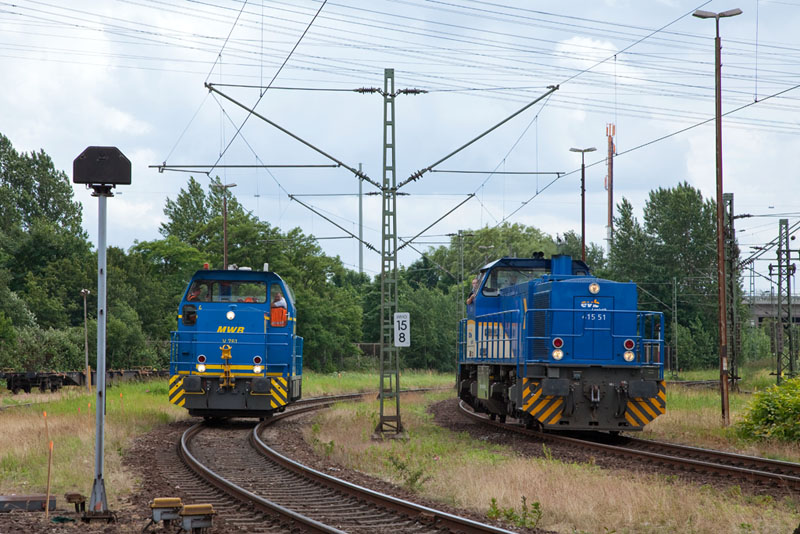 | Begegnung zweier Rangierdiesel der evb Gruppe – die V 761 der evb Mittelweserbahn und 415 51 der evb Logistik. Hamburg-Waltershof, 17. Juni 2012 |