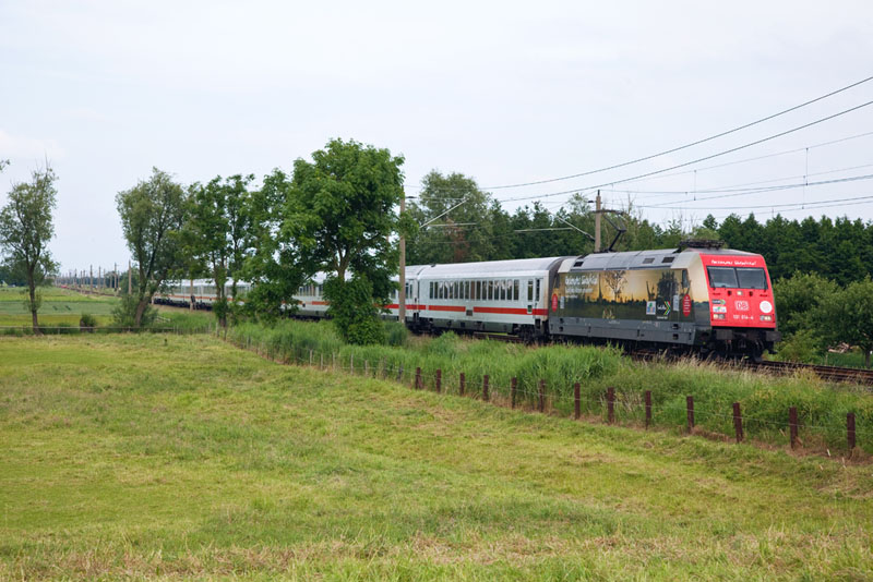| Die ehemalige "unicef"-Werbelok 101 016-4 nun als "Packendes Südafrika"-Werbelok vor dem IC 2315. Blomesche Wildnis, 19. Juni 2012 |