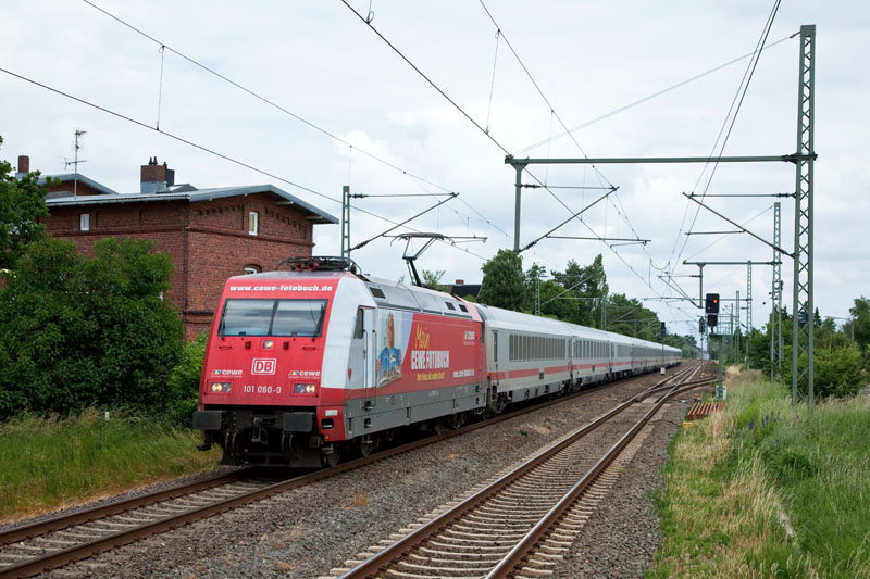 | Die "CEWE"-Werbelok mit Herz – die 101 080-0 vor dem IC 2329 von Kiel. Dauenhof, 19. Juni 2012 |