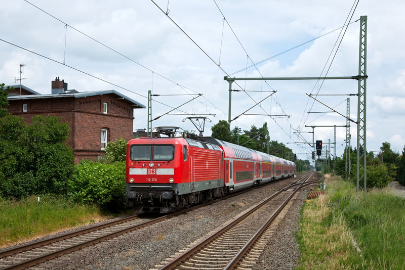 | Die 112 176 mit dem doppelstöckigen RegionalExpress von Kiel nach Hamburg. Dauenhof, 19. Juni 2012 |