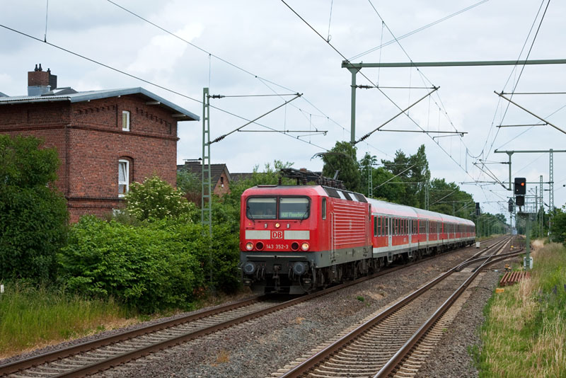 | Eine RegionalBahn nach Pinneberg mit der 143 352-3. Dauenhof, 19. Juni 2012 |