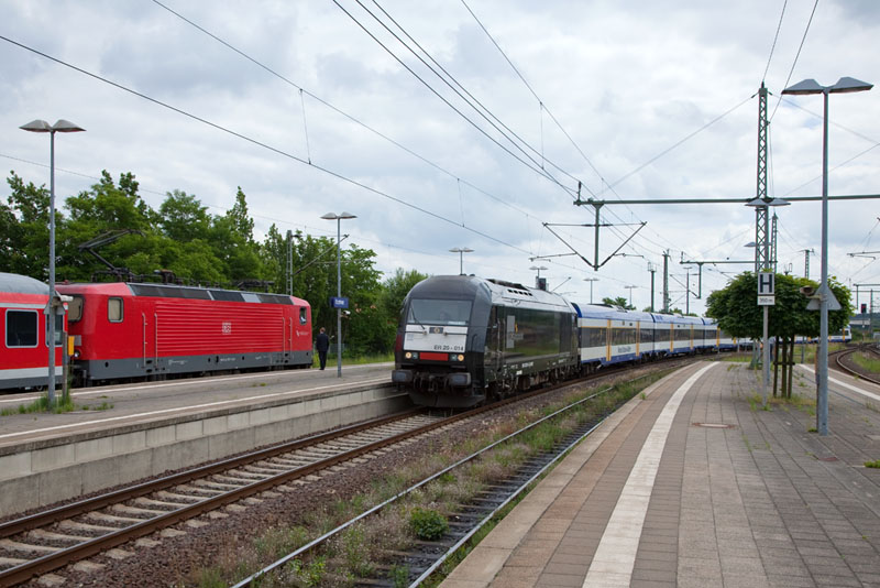 | Einfahrender NOB-Zug nach Westerland (Sylt) mit der schwarzen ER 20-014. Itzehoe, 19. Juni 2012 |