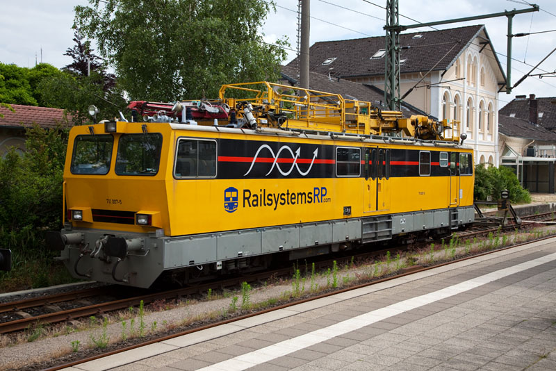 | Am "Hausbahnsteig" stand dieses RailSystemsRP-Fahrzeug 711 007-5. Itzehoe, 19. Juni 2012 |