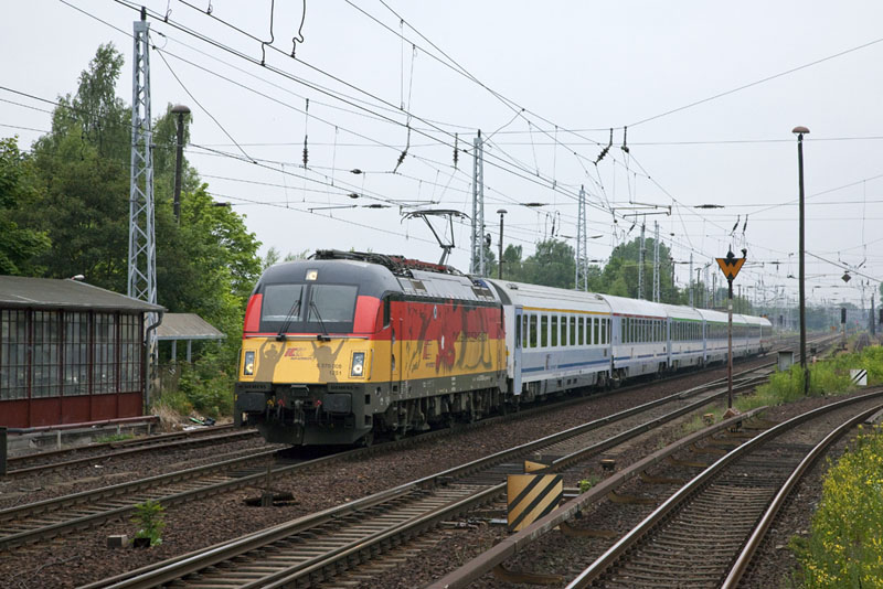 | Der EM-Werbetaurus 370 005 "Deutschland" der PKP mit dem EuroCity 55 nach Danzig. Berlin-Hirschgarten, 27. Juni 2012 |