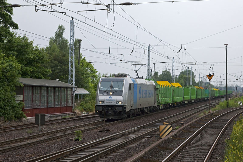 | Die ehemalige PETERSON-Lok, eine "Schweden-Heimkehrerin" 185 686-3 im Einsatz für die SETG! Berlin-Hirschgarten, 27. Juni 2012 |