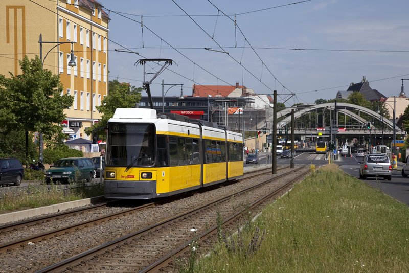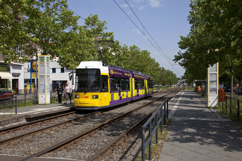 | Tw 1007 beim Fahrgastwechsel auf der Linie M1 in der Haltestelle Masurenstraße. Berlin-Pankow, 29. Juni 2012 |