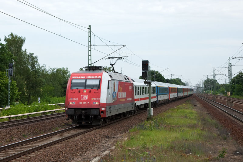 | Mit dem EuroCity 176 von Prag nach Hamburg rauschte die "CEWE"-Werbelok 101 109-7 durch. Berlin-Jungfernheide, 29. Juni 2012 |