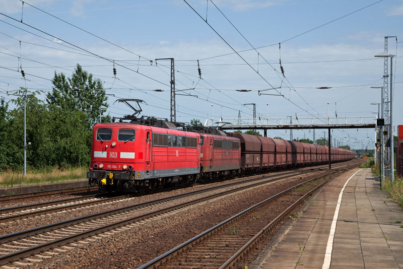 | Ein leerer Erzzug von Ziltendorf nach Hamburg-Hansaport mit den AK-Loks 151 104-7 und 151 110-4. Saarmund, 29. Juni 2012 |