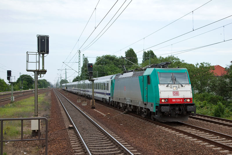 | Wenig später kam die 186 135-0 mit einem anderen Leerreisezug von Schöneweide nach Grunewald – wegen der Fussball-EM sind die Züge ausnahmsweise viel länger. Berlin-Jungfernheide, 29. Juni 2012 | ||