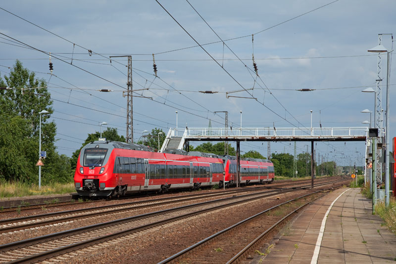 | Die heutige Generation an RB – die neuen Triebzüge 442 629 und 442 630 als RB 22. Saarmund, 29. Juni 2012 |