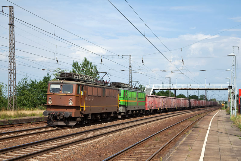 | Noch ein rassiger Ganzzug mit zwei "Holzrollern" der EGP! Die 142 042-1 und 142 103-1 sind die Loks. Saarmund, 29. Juni 2012 |