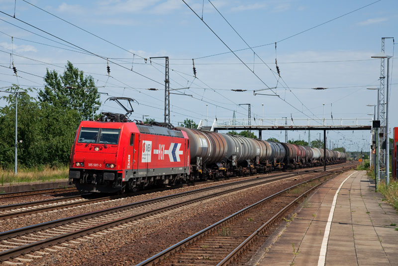 | Auch nach Hamburg ging dieser Kesselwagenzug mit der 185 587-3 der HGK. Saarmund, 29. Juni 2012 |