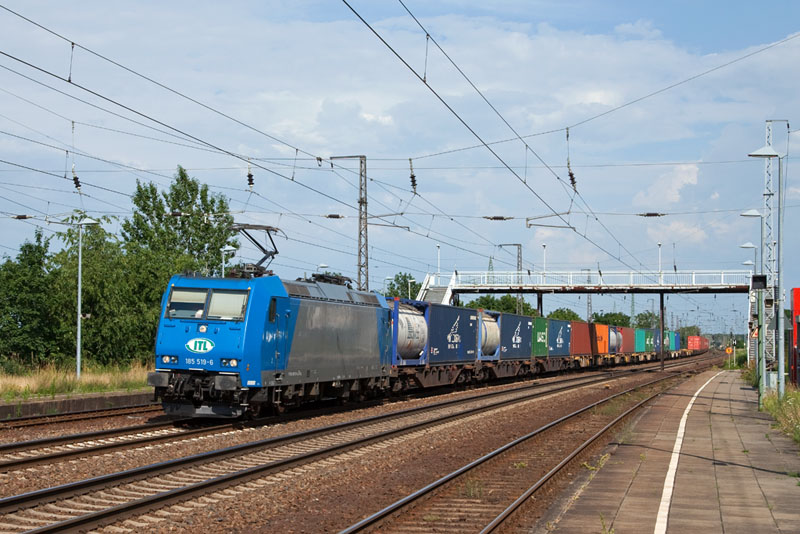 | Ein Containerzug der ITL nach Hamburg mit der 185 519-6, einer ehemaligen VPS-Stammlok. Saarmund, 29. Juni 2012 |