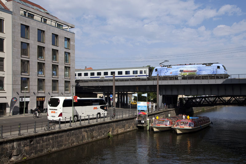 | Der EuroCity 43 startete vorhin im Berliner Hbf, als Zuglok war die 370 007 "Stadion Narodowy" vorgespannt. Berlin Kupfergraben, 29. Juni 2012 |